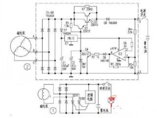 裝置電路如圖所示。磁電機輸出的交流電壓經二極管D1~D6整流後變成脈動直流電壓分兩路輸出。一路由Q1、Q2、Q3、R1、R7、DW1,以及C2組成的典型晶體管串聯穩壓電路穩壓後輸出16V電壓,經D8給蓄電池充電;另一路經D7隔離後由C1濾波、IC1穩壓得到12V直流穩定電壓對運算放大器IC2供電,並且經電阻R6接至IC2的②腳作基準電壓,蓄電池的電壓經R4、R5分壓後送至IC2的③腳作為比較電壓。當蓄電池的電壓低於14。4V時,加至IC2③腳的比較電壓比②腳的12V基準電壓低,運算放大器輸出低電平,Q4截止,Q1~Q3正常工作輸出16V電壓。當蓄電池的電壓高於14。4V時,IC2的③腳比較電壓高於②腳基準電壓,IC2輸出高電平,Q4飽和導通,分流掉流入Q3基極的電流,從而造成Q1Q2的輸出電壓大幅下降,D8截止,停止向蓄電池充電和向電器供電。此時,車上的電器均由蓄電池供電。當蓄電池的電壓再次低於14。4V時,則IC2又輸出低電平,Q1、Q2又正常輸出。顯然,當蓄電池充滿電時,磁電機幾乎工作在空載狀態,而不像常規的矽整流穩壓器那樣處於大負荷短路狀態,這就達到了節能的目的。電路中R3為IC2的正反饋電阻,R7用於在Q1Q2截止時給蓄電池進行涓流充電,D9的作用是保證某些運算放大器的微量零漂輸出不至於導致Q4導通,而產生誤動作。